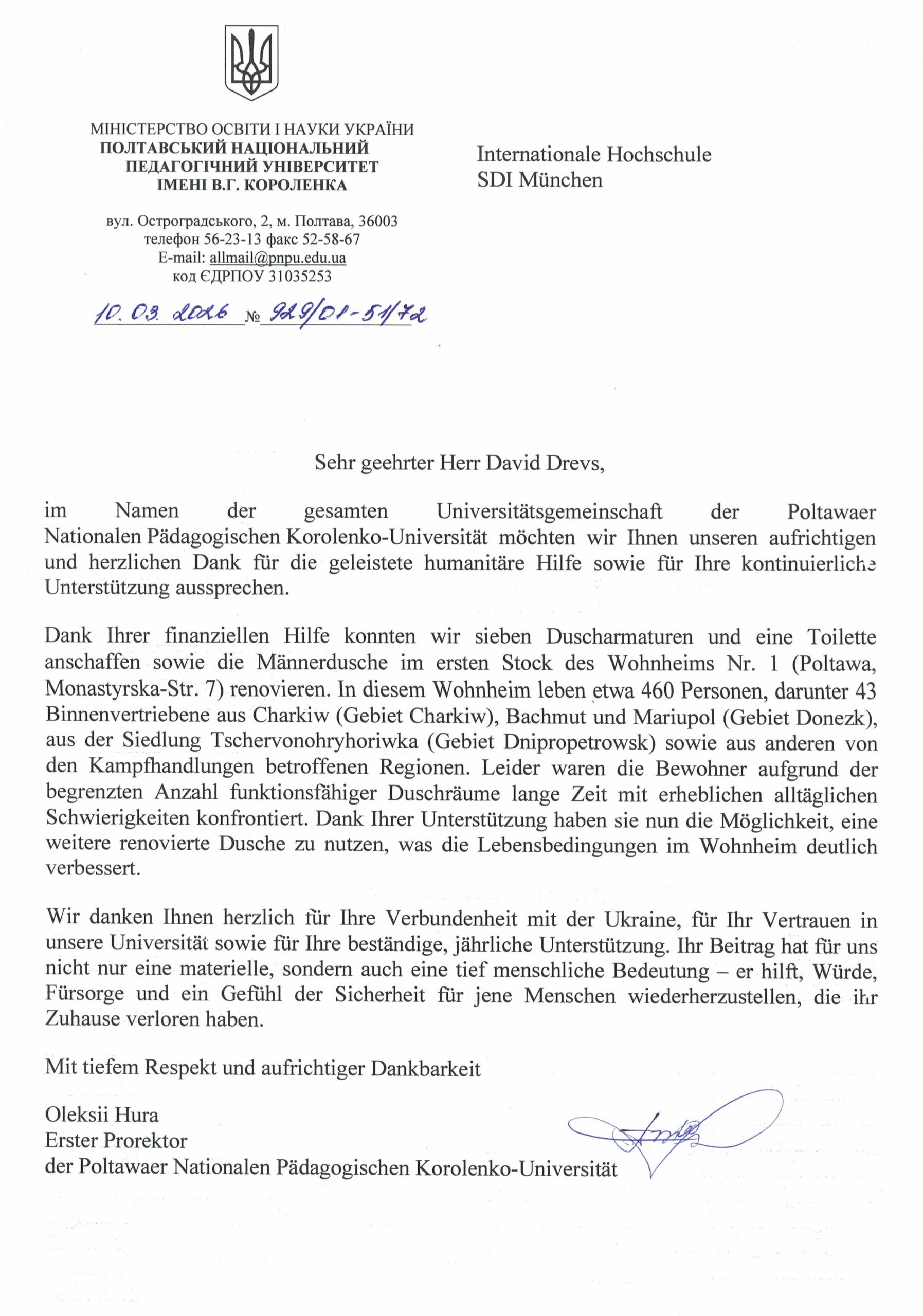 Керівництво університету в особі першого проректора Олексія Гури висловило щиру подяку Давидові Древсу за чергову підтримку та небайдужість до України. Ця допомога безцінна, бо вона не лише покращує повсякденні умови життя переселенців, а й дарує відчуття турботи, солідарності та віри в людяність.