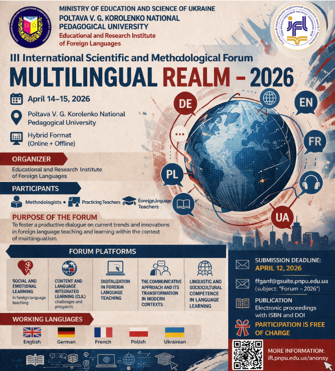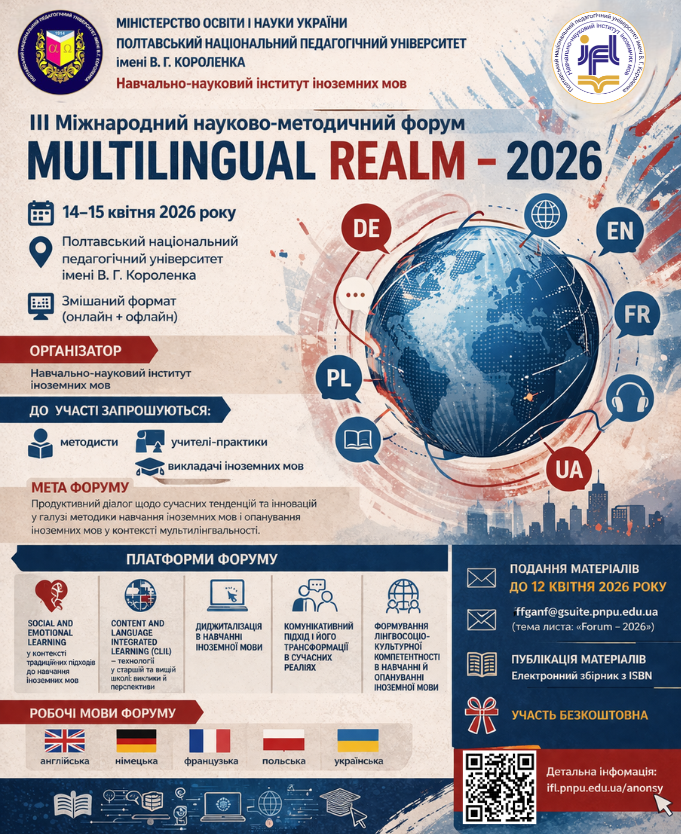 Інформлист MR-2026Завантажити informlyst-gumanitarni-nauky-2026 (2)Завантажити Hum_sem_eng_2026 (2)Завантажити Інформлист ПНПУ Студконфа-2026Завантажити Інформлист Сталий розвиток – 2024Завантажити Sustainable development – 2024Завантажити Інформлист Основні тенденції – 2025Завантажити Інформлист Mutilingual Realm – 2025Завантажити Інформлист Гуманітарні науки – 2025Завантажити Call for papers Scientific DiscourseЗавантажити
