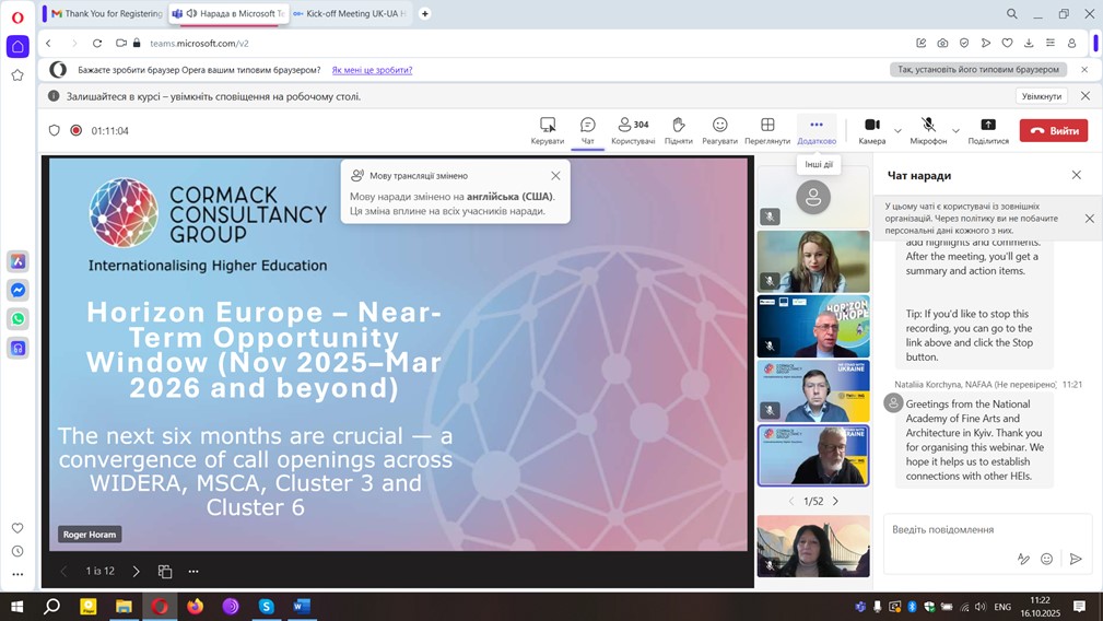 16 жовтня 2025 року відбувся стартовий вебінар програми UK–Ukraine Horizon Europe Collaboration. Організатором заходу став відділ «Офіс Горизонт Європа в Україні» (Horizon Europe Ukraine) Національного фонду досліджень України спільно зUK Science & Technology Network, Cormack Consultancy Group та Міністерством освіти і науки України.«Горизонт Європа» – рамкова програма Європейського Союзу з досліджень та інновацій для фінансування дослідницьких та інноваційних проектів Європейського Союзу в 2021-2027 роках.