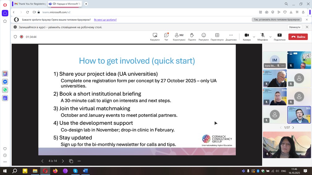 Експерт із фінансування ЄС Роджер Хорам (Roger Horam) презентував найближчі конкурсні можливості програми Horizon Europe, а Олена Бождог (Cormack Consultancy Group) окреслила формат подальших заходів і можливості для встановлення партнерств.