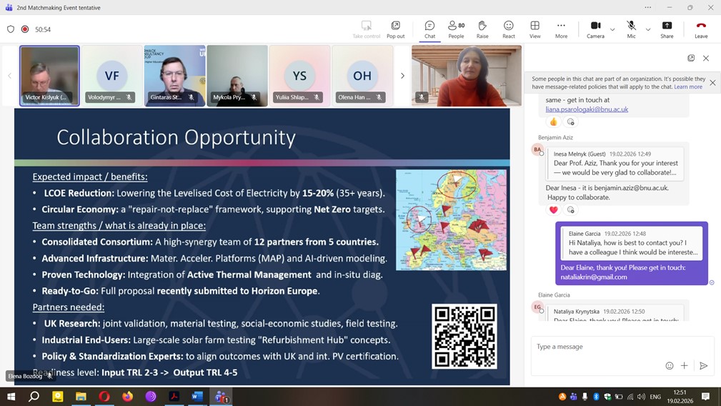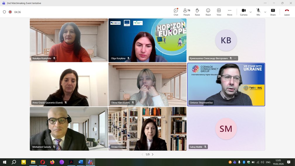 19 лютого 2026 р. завідувачка кафедри романо-германської філології Наталія Криницька взяла участь у другому раунді онлайн-заходу Round 2 – UK–Ukraine Horizon Europe Matchmaking Event, зорганізованого з метою розвитку партнерств між українськими та британськими дослідниками в межах програм Horizon Europe 2026–2027.