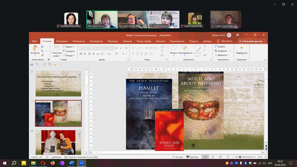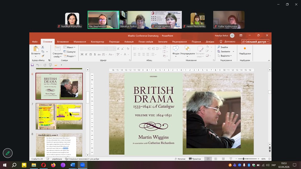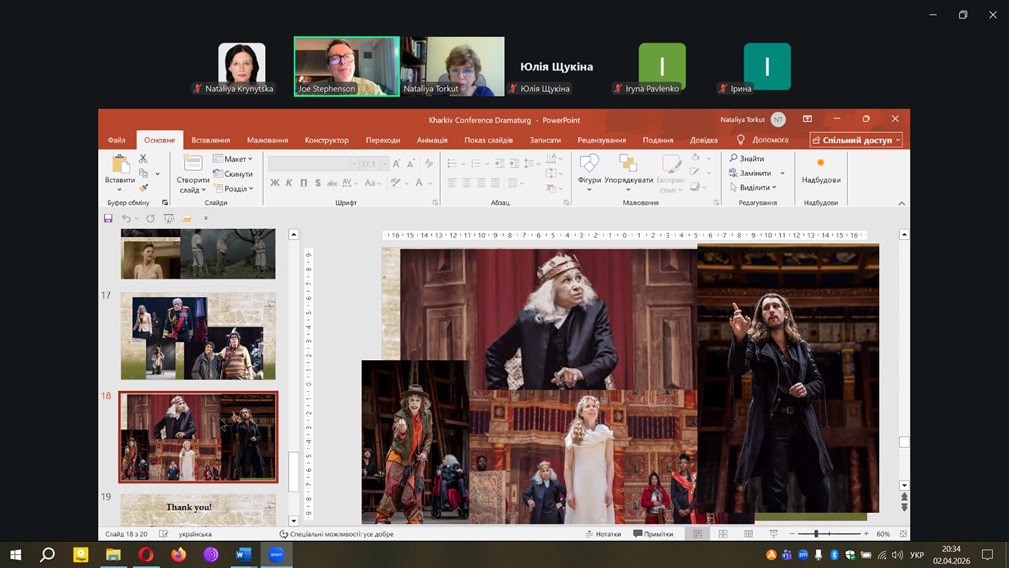 У своїй доповіді професор Джозеф Стівенсон зосередив увагу на ролі драматурга як академічного співучасника театрального процесу. Лектор розкрив багатовимірність цієї професії, наголосивши на її значенні у формуванні концепції вистави, інтерпретації драматичного тексту та встановленні діалогу між режисером, акторами і глядачем. Слухачі отримали цікаву інформацію про вистави й екранізації творів Шекспіра та про онлайн-ресурси з вивчення культурної спадщини Великого Барда. Особливу увагу приділили феномену «подвійного значення» у драматургії, що відкриває ширші можливості для сценічного прочитання класичних творів, зокрема шекспірівських.