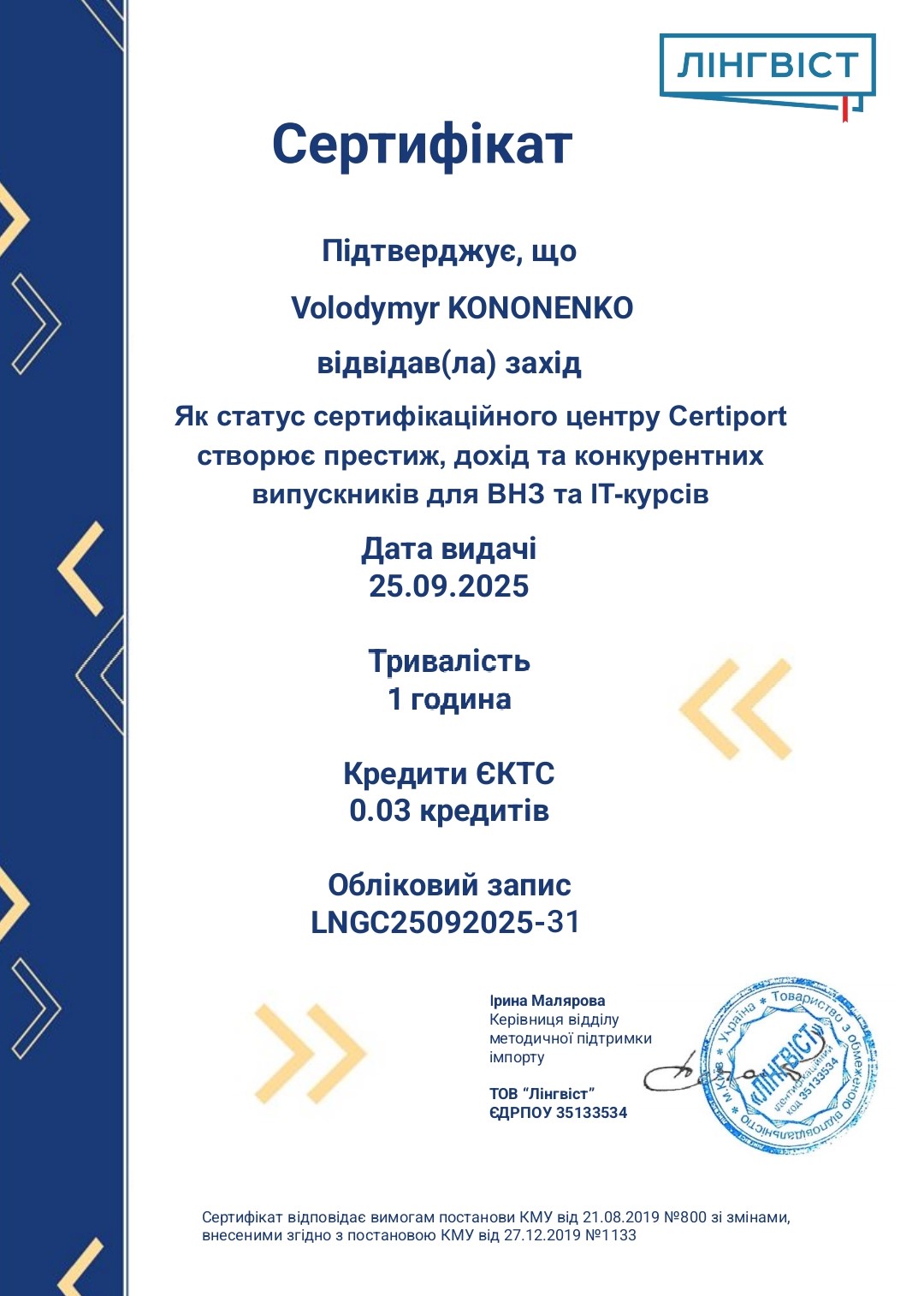 У межах цієї дати доцент кафедри романо-германської філології Володимир Кононенко взяв участь у вебінарі, зорганізованому 25 вересня 2025 року компанією «Лінгвіст», офіційним представником Certiport в Україні. Захід присвятили новим можливостям для закладів вищої освіти, коледжів та провайдерів освітніх курсів України. Спікерки Ірина Малярова, керівниця відділу методичної підтримки імпорту компанії «Лінгвіст», та Оксана Щанкіна, менеджерка проєкту Certiport, ознайомили учасників вебінару з основними перевагами співпраці з компанією «Лінгвіст».