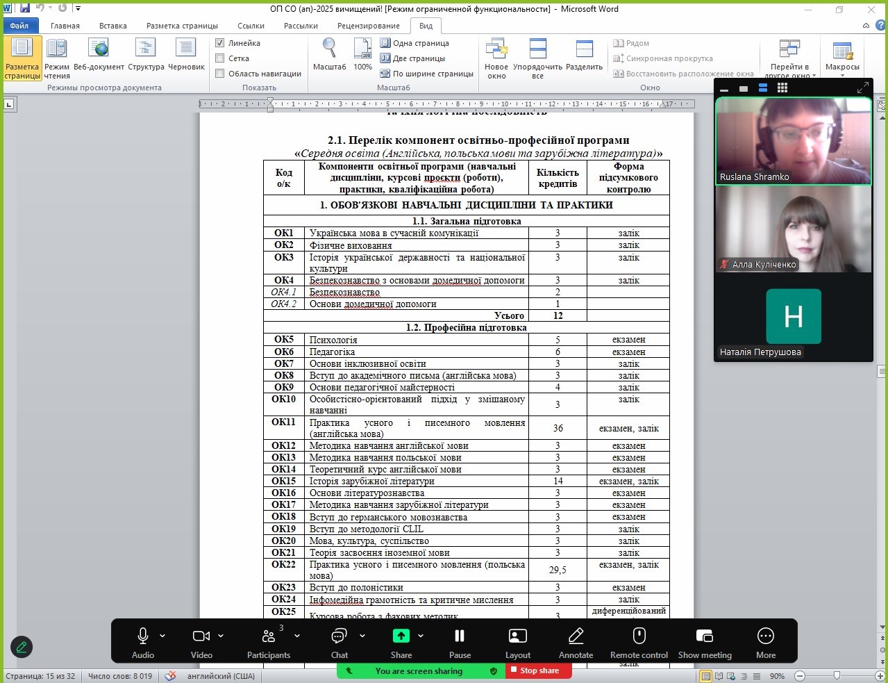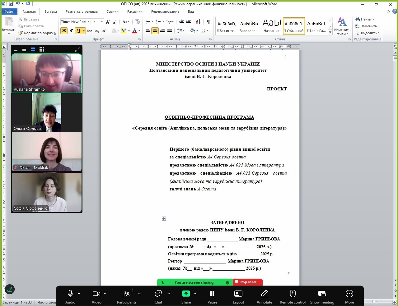 У засіданні взяли участь гарантка освітньо-професійної програми, доцентка кафедри англійської та німецької філології Руслана Шрамко, члени робочої групи – кандидатка філологічних наук, доцентка кафедри англійської та німецької філології Наталія Петрушова, кандидатка педагогічних наук, доцентка кафедри світової літератури Ольга Орлова, кандидат філологічних наук, доцент кафедри іноземних мов і методик їх навчання Кременецької обласної гуманітарно-педагогічної академії імені Тараса Шевченка Василь Кучер, а також студентка 2 курсу групи Ін(а/п)–28 Софія Сірооченко.