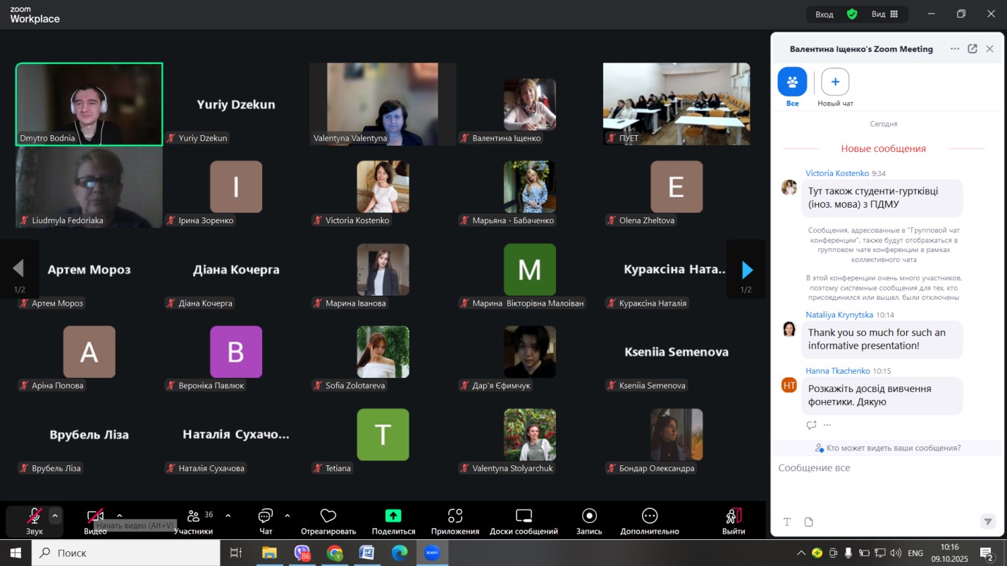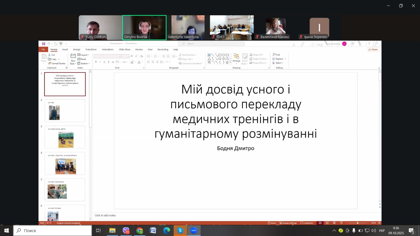 9 жовтня 2025 р. завідувачка кафедри романо-германської філології Наталія Криницька й доцент кафедри романо-германської філології Юрій Дзекун разом зі студентами другого й третього курсів освітньо-професійної програми «Німецька філологія та переклад» мали унікальну змогу доєднатися до онлайн-зустрічі з перекладачем-практиком, молодшим фахівцем з аналізу даних Представництва HALO Trust в Україні Дмитром Боднею.